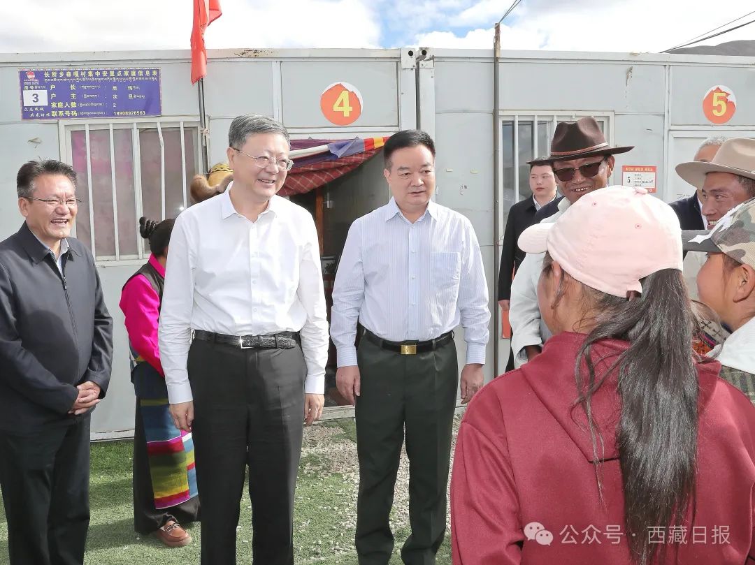 7月11日至12日,上海市代表团来藏考察。上海市委书记陈吉宁、自治区党委书记王君正参加。这是陈吉宁和王君正来到日喀则市定日县长所乡森嘎村安置点,看望慰问受灾群众。记者 白玛泽旺 摄