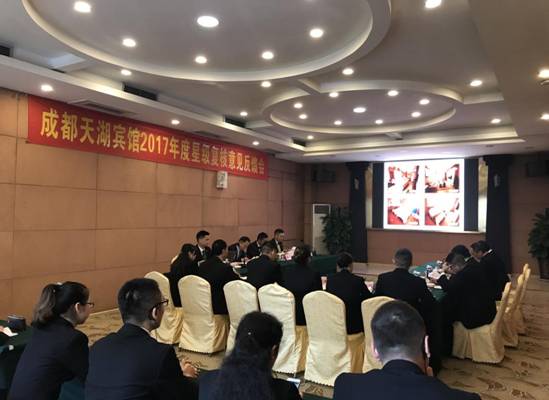 10月26-27日,成都市星级评定委员会专家组一行4人到天湖宾馆进行为期2天的年度星级复核,宾馆顺利通过2017年度星级复核。