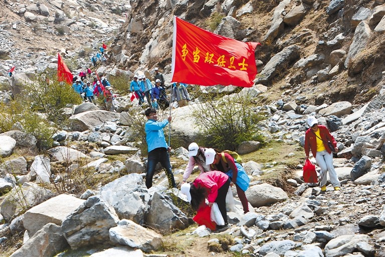 拉萨市城关区组织志愿者开展郊外环保活动。