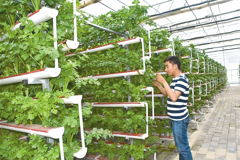 拉萨市城关区净土高标准智能温室的墙体式无土水栽芹菜。