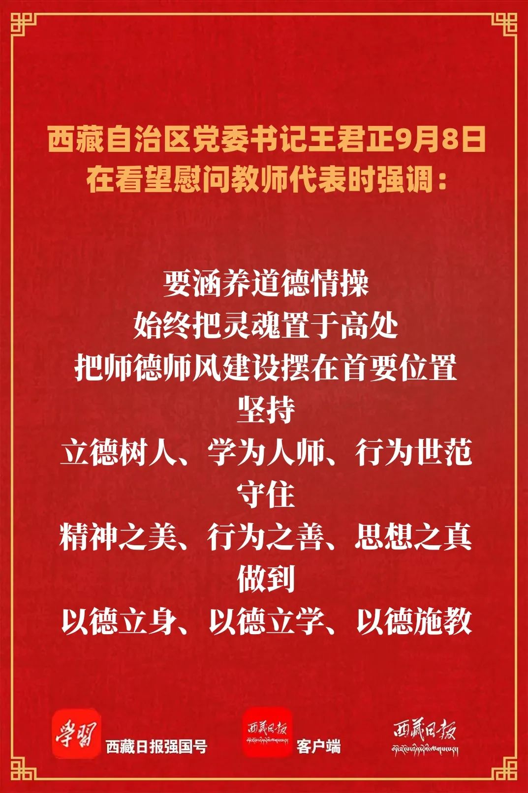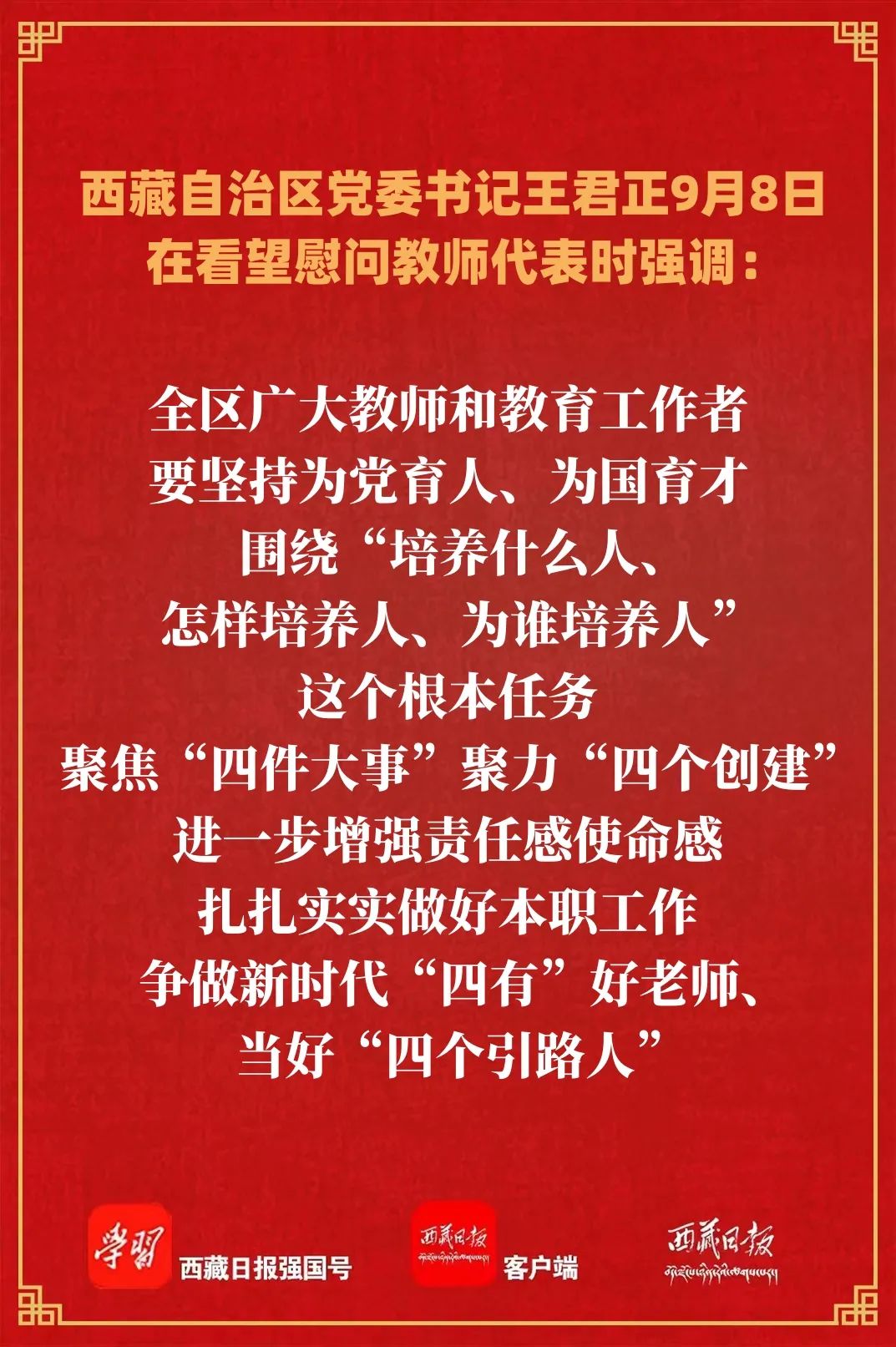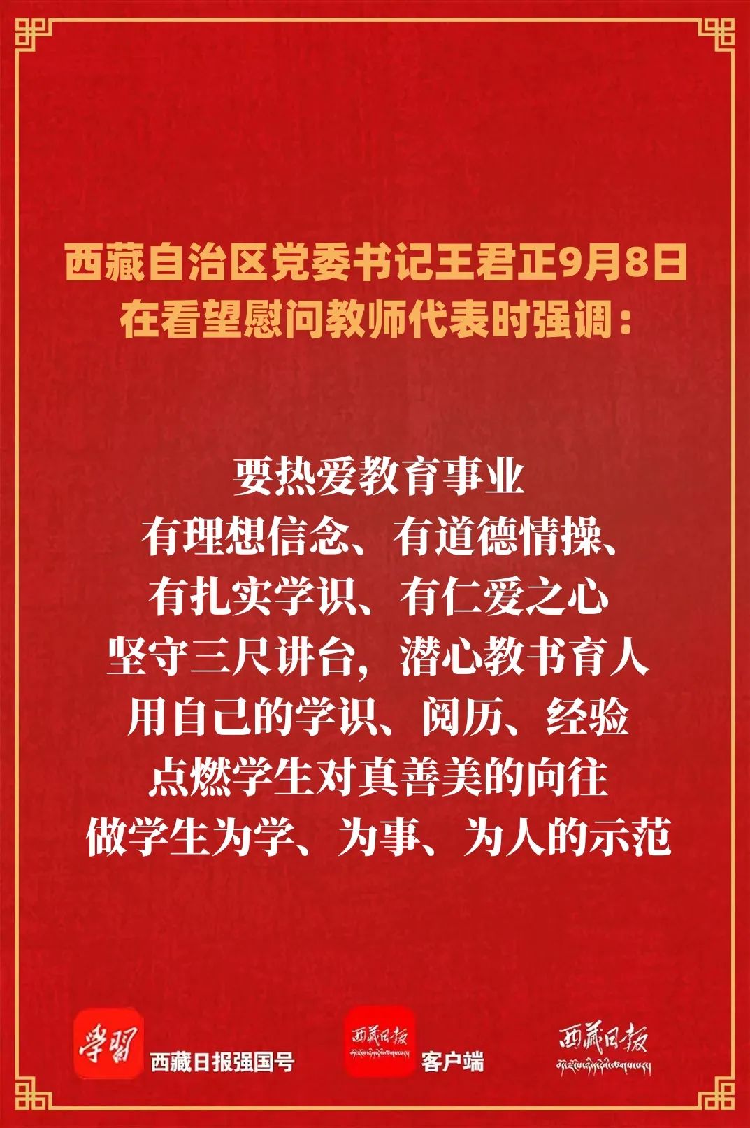 在第三十九个教师节来临之际,9月8日,自治区党委书记王君正,自治区党委副书记、自治区主席严金海分别看望慰问教师代表,向全区广大教师和教育工作者致以节日问候和诚挚感谢。王君正勉励全区广大教师和教育工作者要深入贯彻落实习近平总书记关于教育工作的重要指示精神,全面贯彻党的教育方针,坚持把立德树人作为根本任务,为全面建设社会主义现代化新西藏培养更多优秀人才。