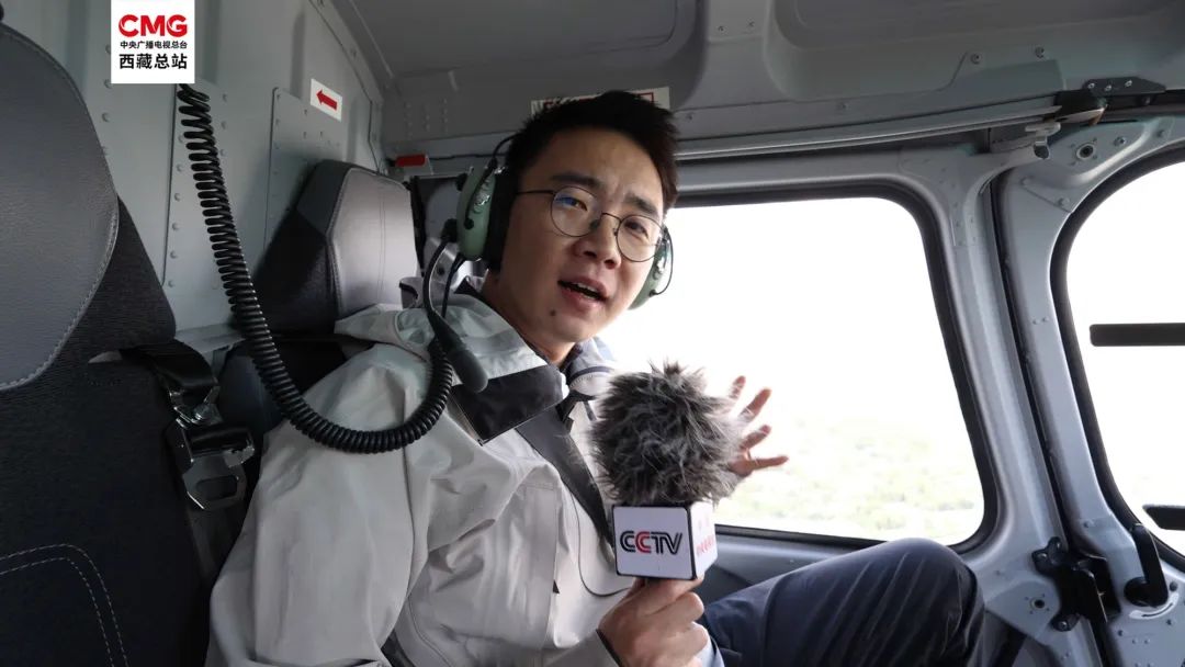图为:总台记者吕小品乘直升机鸟瞰新拉萨