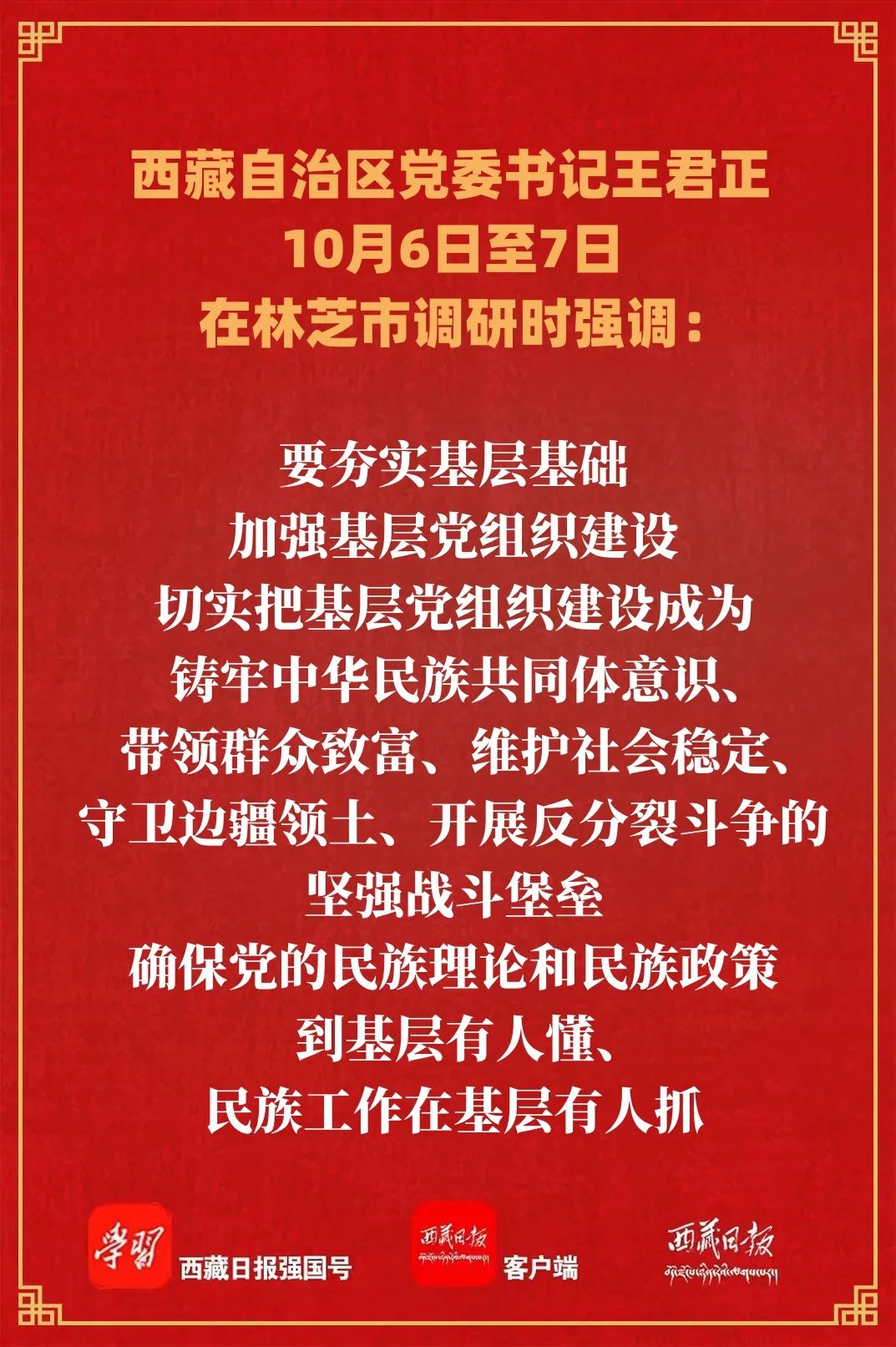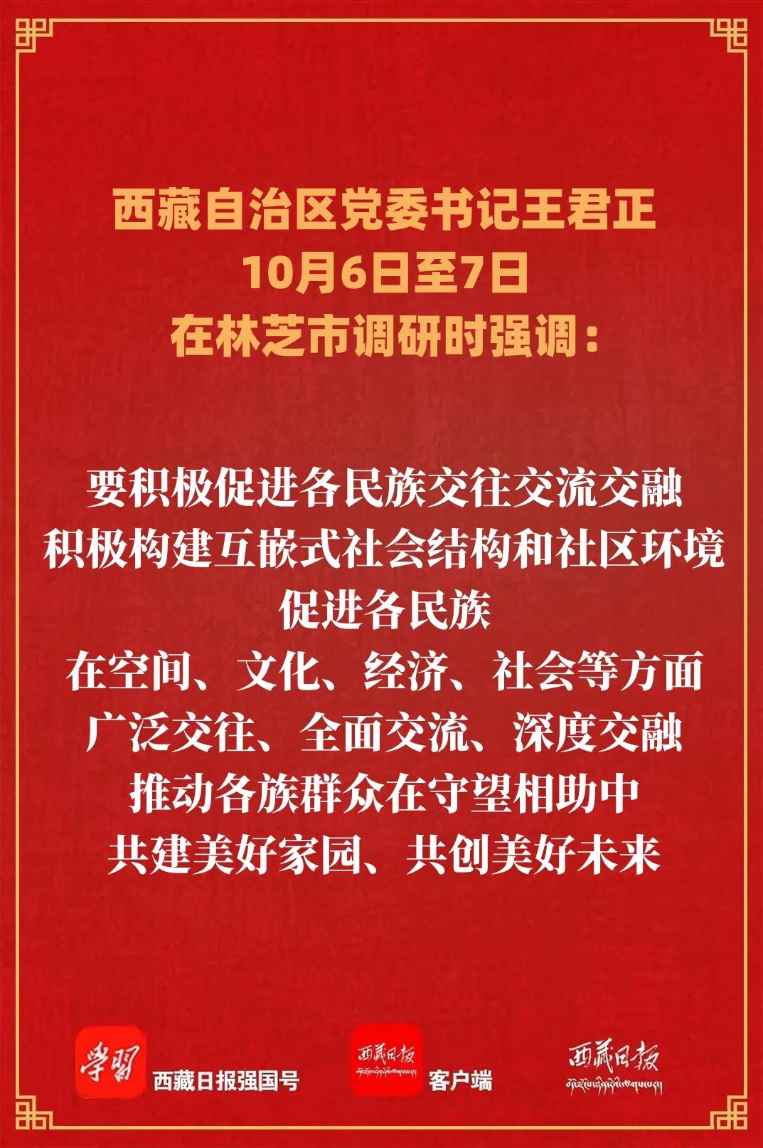 10月6日至7日,自治区党委书记王君正在林芝市巴宜区、米林市调研。他强调,要深入学习贯彻习近平法治思想、习近平总书记关于加强和改进民族工作的重要思想,全面贯彻落实习近平总书记关于西藏工作的重要指示和新时代党的治藏方略,坚持依法治藏,促进民族团结,铸牢中华民族共同体意识,为西藏长治久安和高质量发展作出更大贡献。