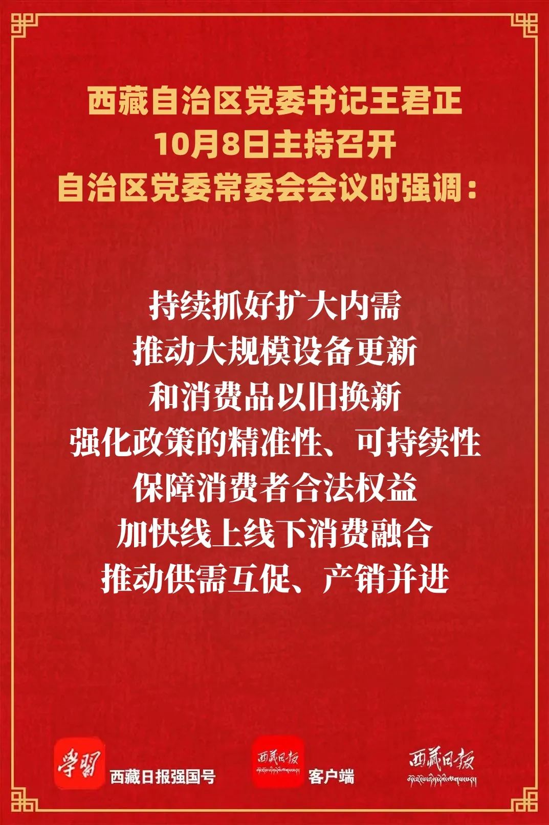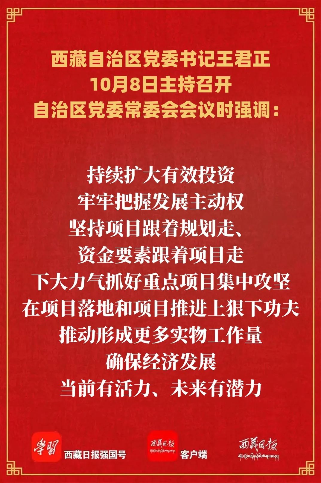 王君正强调,要深入贯彻落实习近平总书记关于西藏工作的重要指示和新时代党的治藏方略,坚持所有发展都要赋予民族团结进步的意义,都要赋予维护统一、反对分裂的意义,都要赋予改善民生、凝聚人心的意义,都要有利于提升各族群众获得感、幸福感、安全感,坚定不移贯彻新发展理念,努力推动西藏经济高质量发展。持续扩大有效投资,牢牢把握发展主动权,坚持项目跟着规划走、资金要素跟着项目走,下大力气抓好重点项目集中攻坚,在项目落地和项目推进上狠下功夫,推动形成更多实物工作量,确保经济发展当前有活力、未来有潜力。加快构建现代化产业体系,立足西藏特色优势资源,推动传统产业转型升级,加强技术改造和创新驱动,提高产品附加值和市场竞争力,积极培育战略性新兴产业和数字经济等新业态,结合实际发展与群众生产生活息息相关的轻工业,提升文旅等产业供给水平,强化品牌建设,为经济发展注入新动力。持续抓好扩大内需,推动大规模设备更新和消费品以旧换新,强化政策的精准性、可持续性,保障消费者合法权益,加快线上线下消费融合,推动供需互促、产销并进。持续优化营商环境,深化“放管服”改革,进一步完善招商引资政策措施,实施招商引资百日攻坚行动,深化“双招双引”工作,做强园区、口岸、保税区、边合区、物流枢纽等开放平台,进一步增强开放活力。做好就业和增收工作,持续拓宽高校毕业生就业渠道,扎实做好重点人群就业工作和低收入群体救助帮扶,细化落实促进城乡居民增收具体措施,发挥重大项目带动就业、培养人才作用,加强职业技能培训和就业服务指导,实现持续稳定增收。