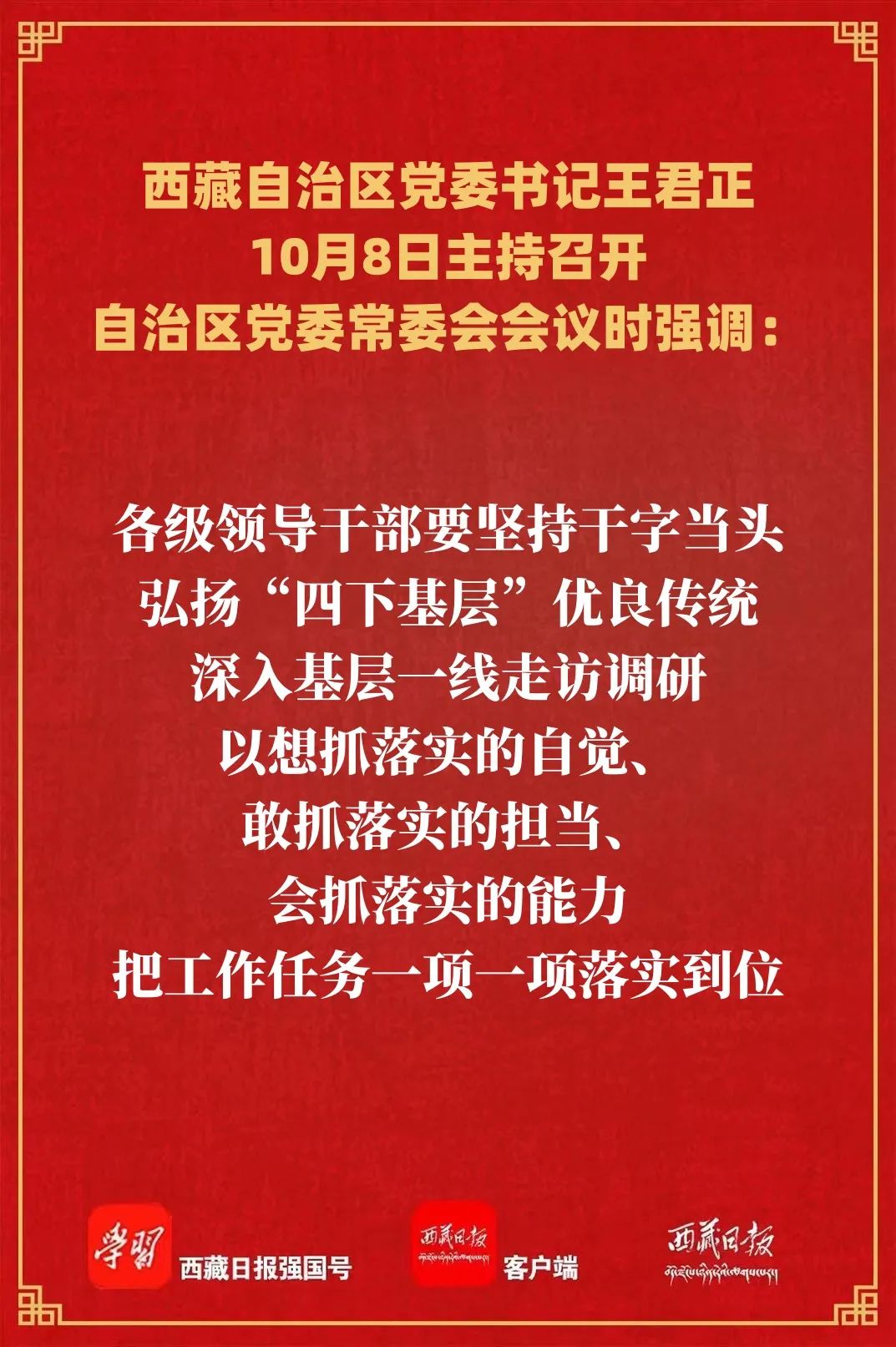王君正强调,全区各级各部门要加强对经济工作的组织领导和统筹协调,紧盯全年目标任务,加强经济运行监测分析调度,进一步增强工作的前瞻性、针对性。科学谋划明年经济社会发展工作,强化统筹、周密部署、精心组织,做到心中有数、手中有策、行动有力。各级领导干部要坚持干字当头,弘扬“四下基层”优良传统,深入基层一线走访调研,以想抓落实的自觉、敢抓落实的担当、会抓落实的能力,把工作任务一项一项落实到位。各级督查部门要把经济工作作为督查重要内容,实时跟进本年度经济社会发展目标任务和工作进展,加强督查结果运用,抓好典型引路示范带动,确保党中央决策部署和自治区党委工作要求落地落实,努力推动西藏长治久安和高质量发展不断取得新成效。