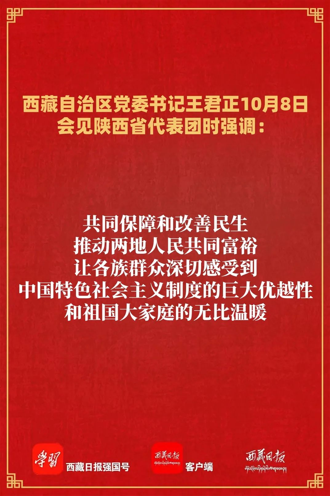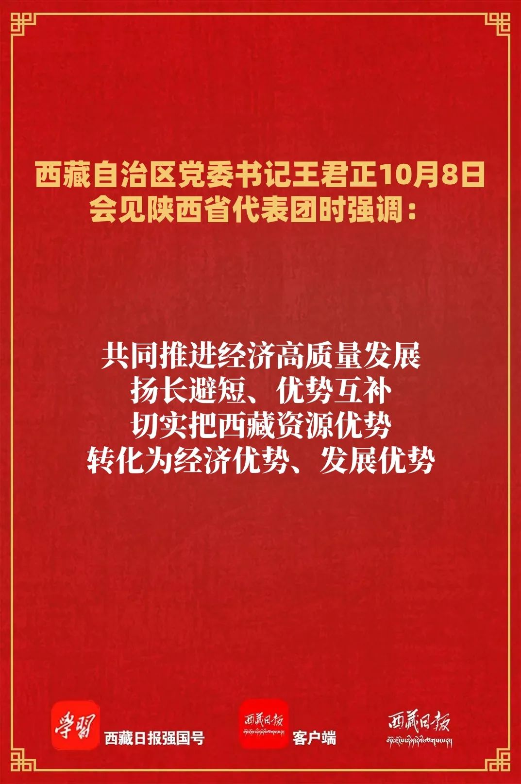 王君正强调,西藏是重要的国家安全屏障、生态安全屏障。党的十八大以来,习近平总书记高度重视西藏工作,亲临西藏视察指导,多次对西藏工作作出重要指示,确立了新时代党的治藏方略,明确了“稳定、发展、生态、强边”四件大事,为推进西藏长治久安和高质量发展指明了前进方向、提供了根本遵循。当前的西藏,政治安定、社会稳定、经济发展、民族团结、宗教和睦、人民安居乐业,呈现出一派欣欣向荣的良好景象,为社会主义现代化新西藏建设打下了坚实基础。陕西与西藏交往交流交融历史源远流长。在解放西藏、建设西藏的伟大历程中,陕西省给予了无私援助、大力支持。今年是全国对口支援西藏30周年,30年来陕西省委、省政府始终站在党和国家战略全局的高度,认真贯彻落实党中央关于援藏工作的决策部署,紧扣受援地需求推进各项工作落地落实,为西藏长治久安和高质量发展作出了积极贡献。我们要共同学习领会新时代推动西部大开发座谈会精神特别是习近平总书记重要讲话精神、共同贯彻落实习近平总书记关于西藏工作的重要指示和新时代党的治藏方略,以维护祖国统一、加强民族团结为着眼点和着力点,坚持以铸牢中华民族共同体意识为主线,促进两地人员往来、人心相通、情感交流;共同推进经济高质量发展,扬长避短、优势互补,切实把西藏资源优势转化为经济优势、发展优势;共同保障和改善民生,推动两地人民共同富裕,让各族群众深切感受到中国特色社会主义制度的巨大优越性和祖国大家庭的无比温暖。
