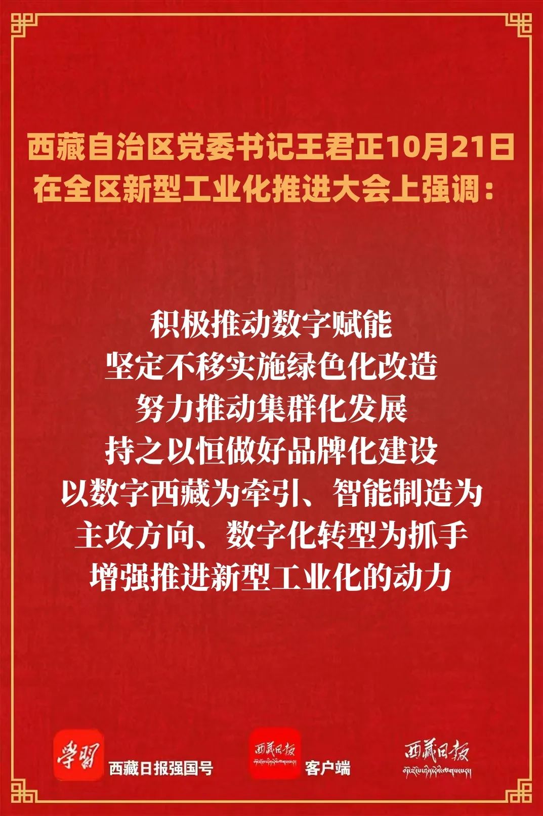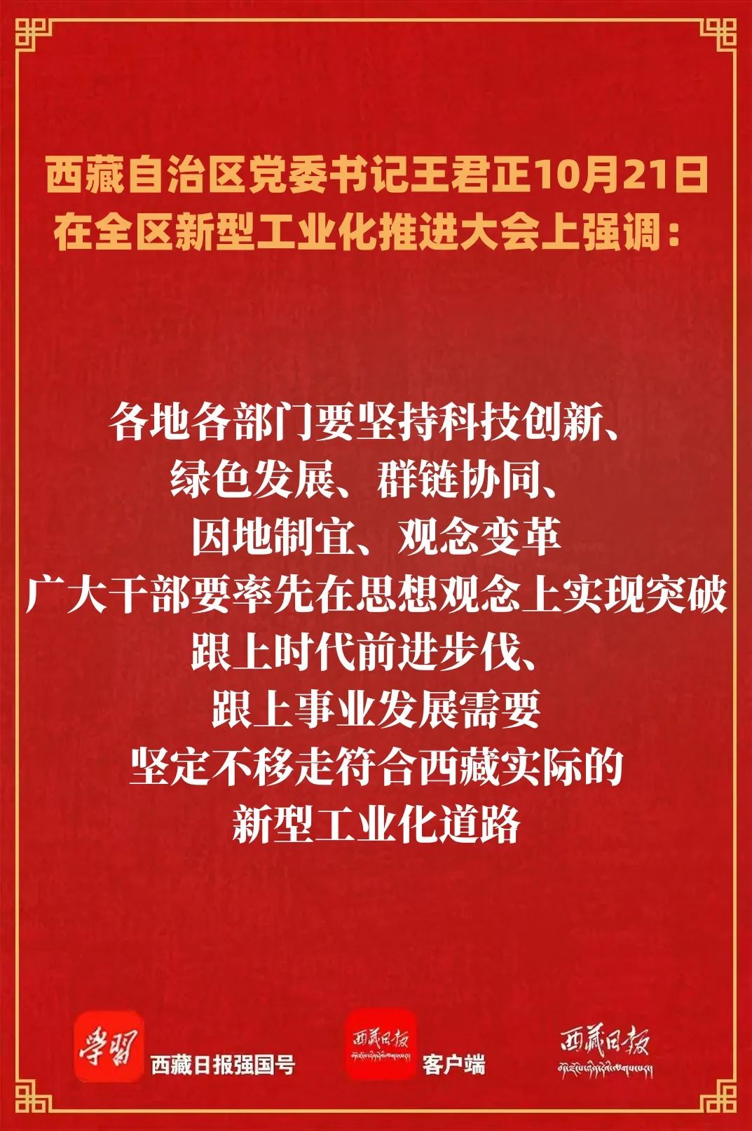 10月21日上午,全区新型工业化推进大会在拉萨召开。自治区党委书记王君正出席并讲话。强调,要认真贯彻落实习近平总书记关于新型工业化的重要指示精神和全国新型工业化推进大会精神,准确把握形势,理清工作思路,明确目标任务,突出工作重点,切实增强推进新型工业化的责任感、使命感,努力提升我区新型工业化发展水平,为西藏长治久安和高质量发展贡献力量。