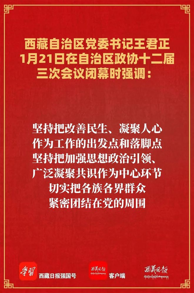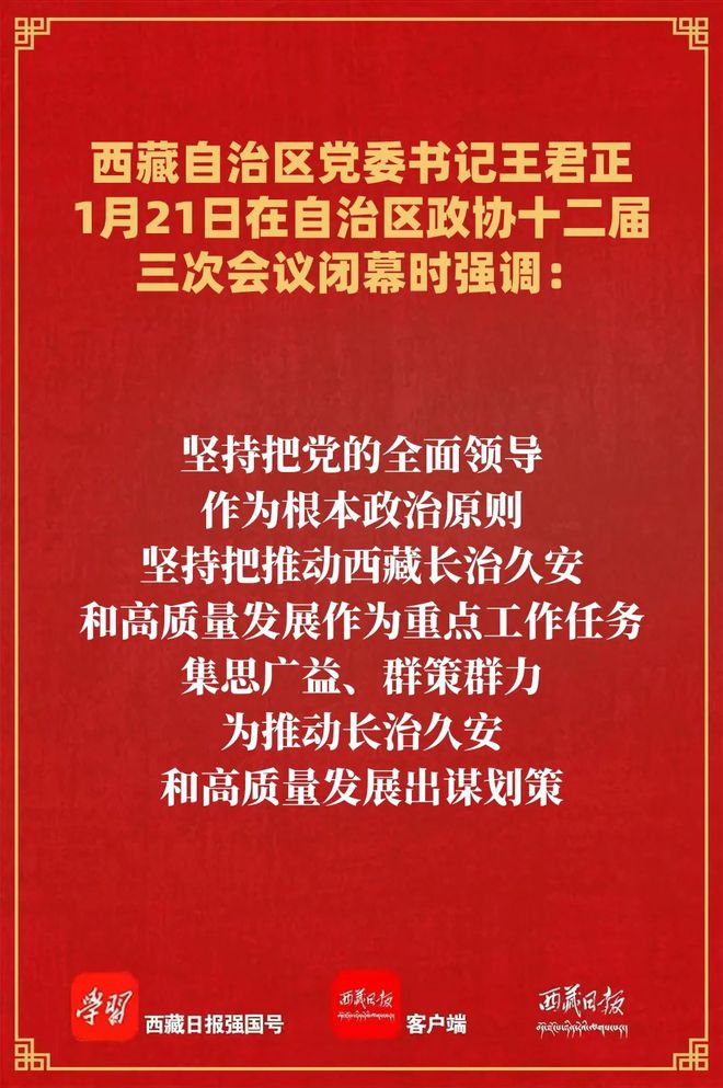 王君正强调,要坚持把党的全面领导作为根本政治原则,更加坚定拥护“两个确立”、坚决做到“两个维护”。坚持用习近平新时代中国特色社会主义思想凝心铸魂,认真学习领会习近平总书记关于加强和改进人民政协工作的重要思想,深刻领悟“两个确立”的决定性意义,增强“四个意识”、坚定“四个自信”、做到“两个维护”,始终在思想上政治上行动上同以习近平同志为核心的党中央保持高度一致;发挥好政协重要阵地、重要平台、重要渠道作用,引导政协委员和各族各界人士不断增进对中国共产党和中国特色社会主义的政治认同、思想认同、理论认同、情感认同,确保习近平总书记重要指示精神和党中央决策部署在西藏落地生根、开花结果。要坚持把推动西藏长治久安和高质量发展作为重点工作任务,努力做到协商有方、监督有力、参政有为。把政协工作置于西藏经济社会发展大局中思考谋划推动,聚焦“稳定、发展、生态、强边”四件大事,紧盯改革发展稳定的难点堵点热点问题,深入调查研究,组织开展民主监督,集思广益、群策群力,为推动长治久安和高质量发展出谋划策。要坚持把改善民生、凝聚人心作为工作的出发点和落脚点,当好党的政策宣传者、群众利益维护者、社会和谐促进者。牢固树立以人民为中心的发展思想,走好新时代党的群众路线,把党的创新理论宣讲好,把党的惠民利民政策宣传好,把群众的意见诉求反映好,架起党和群众的“连心桥”;围绕各族群众急难愁盼问题,灵活开展专题协商,客观精准提出工作提案,助力实施就业、教育、医疗、社保等“十大民生工程”,不断增强各族群众获得感幸福感安全感。要坚持把加强思想政治引领、广泛凝聚共识作为中心环节,努力汇聚起建设社会主义现代化新西藏的磅礴力量。坚持大团结大联合,把协商民主贯穿政治协商、民主监督、参政议政全过程,丰富协商形式、拓宽协商渠道;加强与民族宗教界代表人士、新的社会阶层人士等各界人士的团结联谊,做好委员联系界别群众工作,切实把各族各界群众紧密团结在党的周围。要坚持把加强自身建设、强化委员责任担当作为根本要求,有效发挥专门协商机构作用、彰显人民政协治理效能。健全协商民主机制,加强人民政协履职能力建设,不断提高政协工作制度化、规范化、程序化水平;努力提升自身修养、锤炼过硬作风,不断提高政治把握能力、调查研究能力、联系群众能力、合作共事能力,充分展现新时代政协委员良好形象。