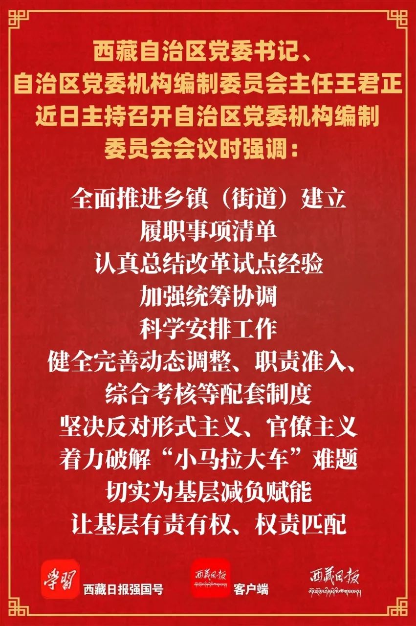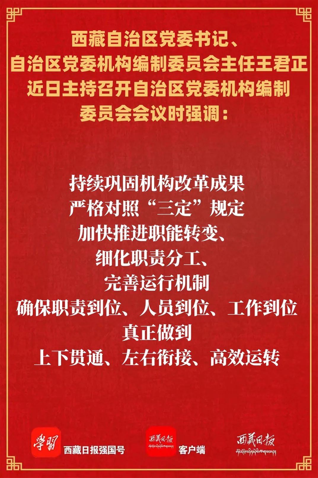 近日,自治区党委书记、自治区党委机构编制委员会主任王君正主持召开自治区党委机构编制委员会会议,传达学习中央有关会议精神,研究我区机构编制有关事项,安排部署下一步工作。强调,要深入学习贯彻习近平总书记关于机构编制工作的重要指示精神,发扬优良传统,借鉴先进经验,积极探索实践,不断提高机构编制工作科学化规范化水平,为建设社会主义现代化新西藏提供有力保障。