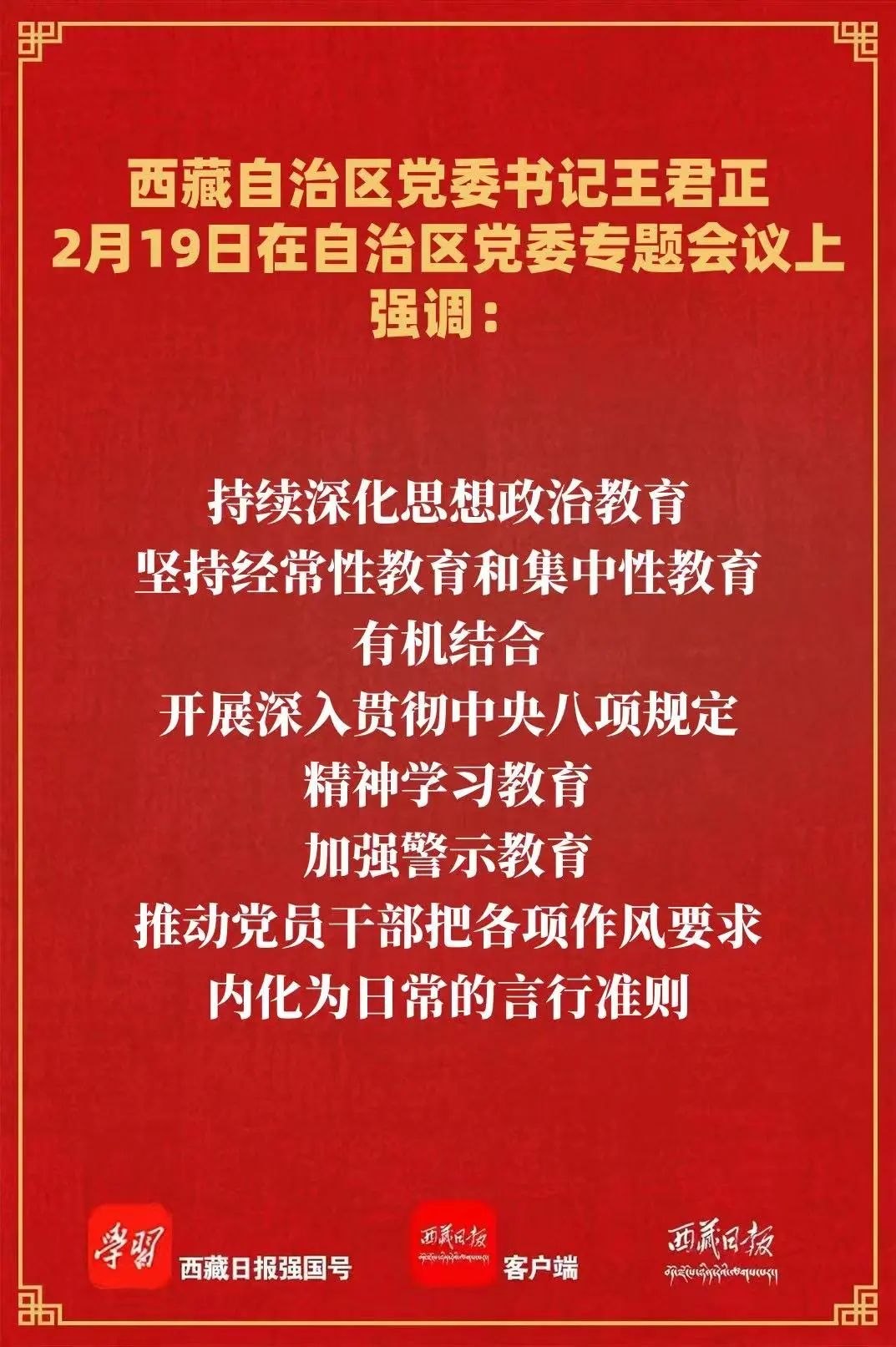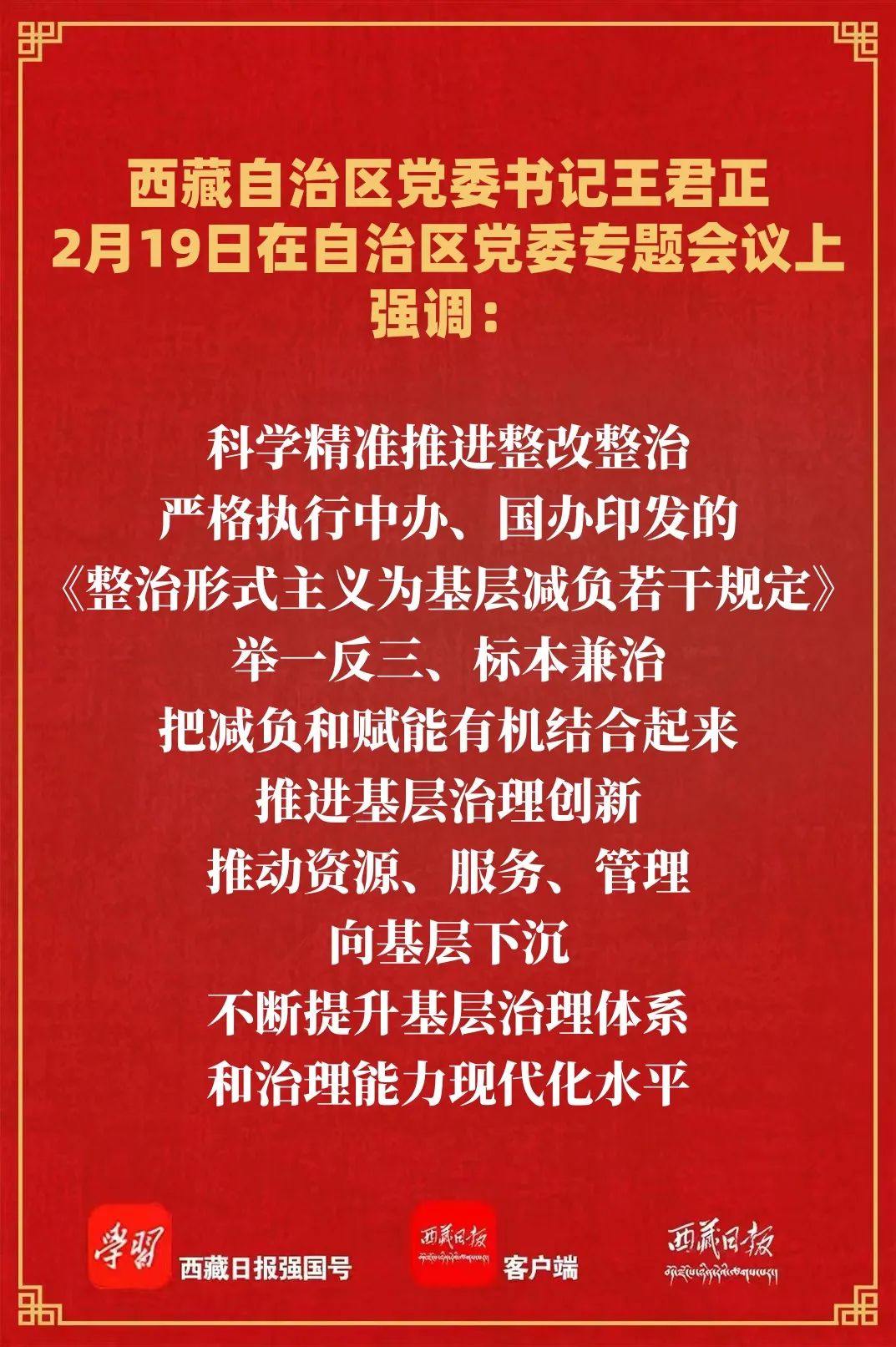2月19日,自治区党委书记王君正主持召开自治区党委专题会议,认真传达学习中央层面整治形式主义为基层减负专项工作机制会议精神,听取自治区贯彻落实中央八项规定精神和整治形式主义为基层减负工作情况汇报。强调,要深入学习贯彻习近平总书记重要指示精神,锲而不舍落实中央八项规定及其实施细则精神,扎实推进整治形式主义为基层减负,以优良作风为建设社会主义现代化新西藏提供坚强保障。