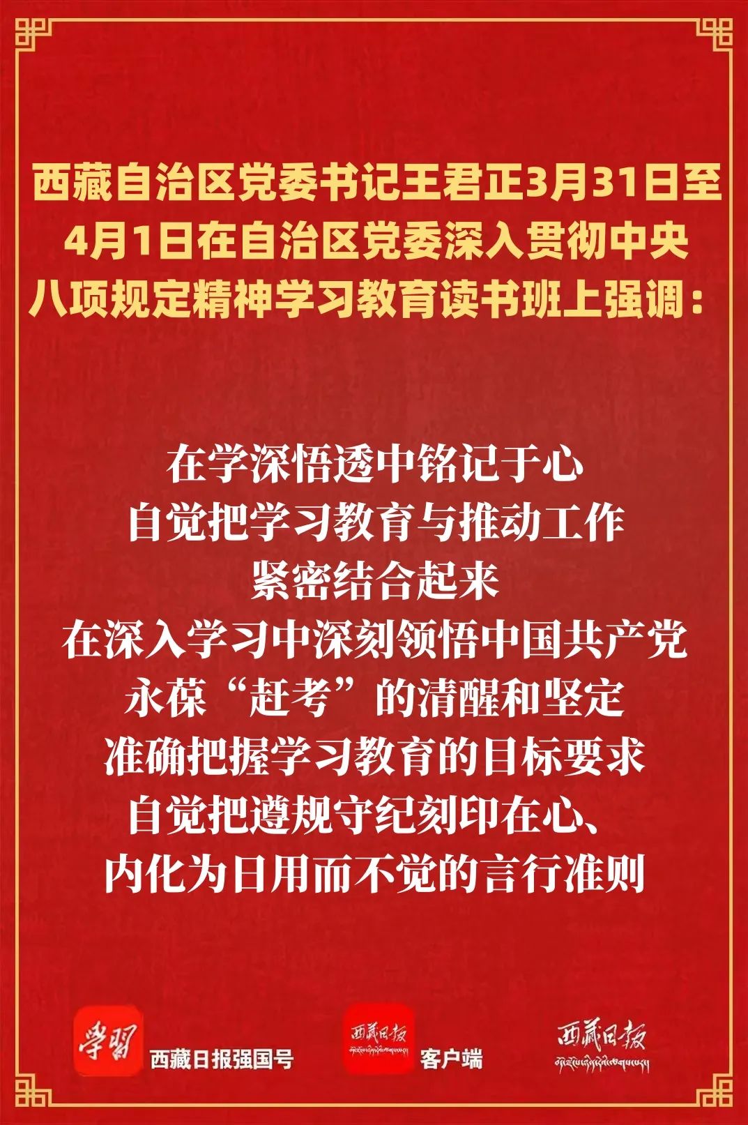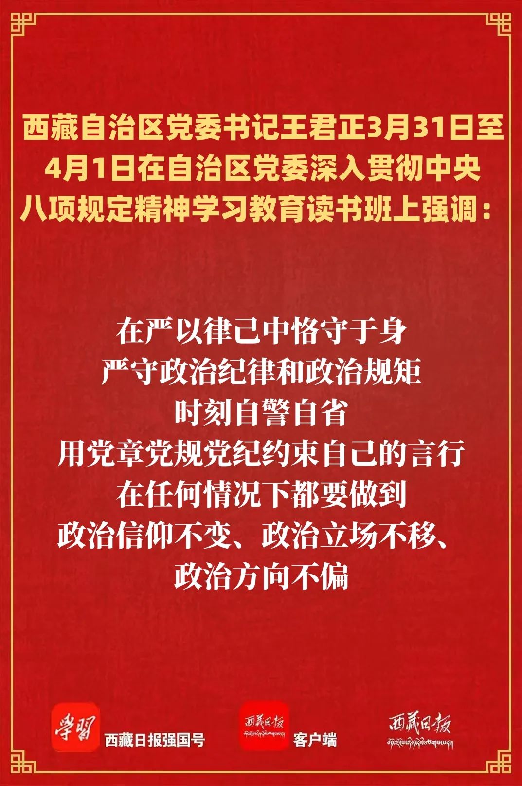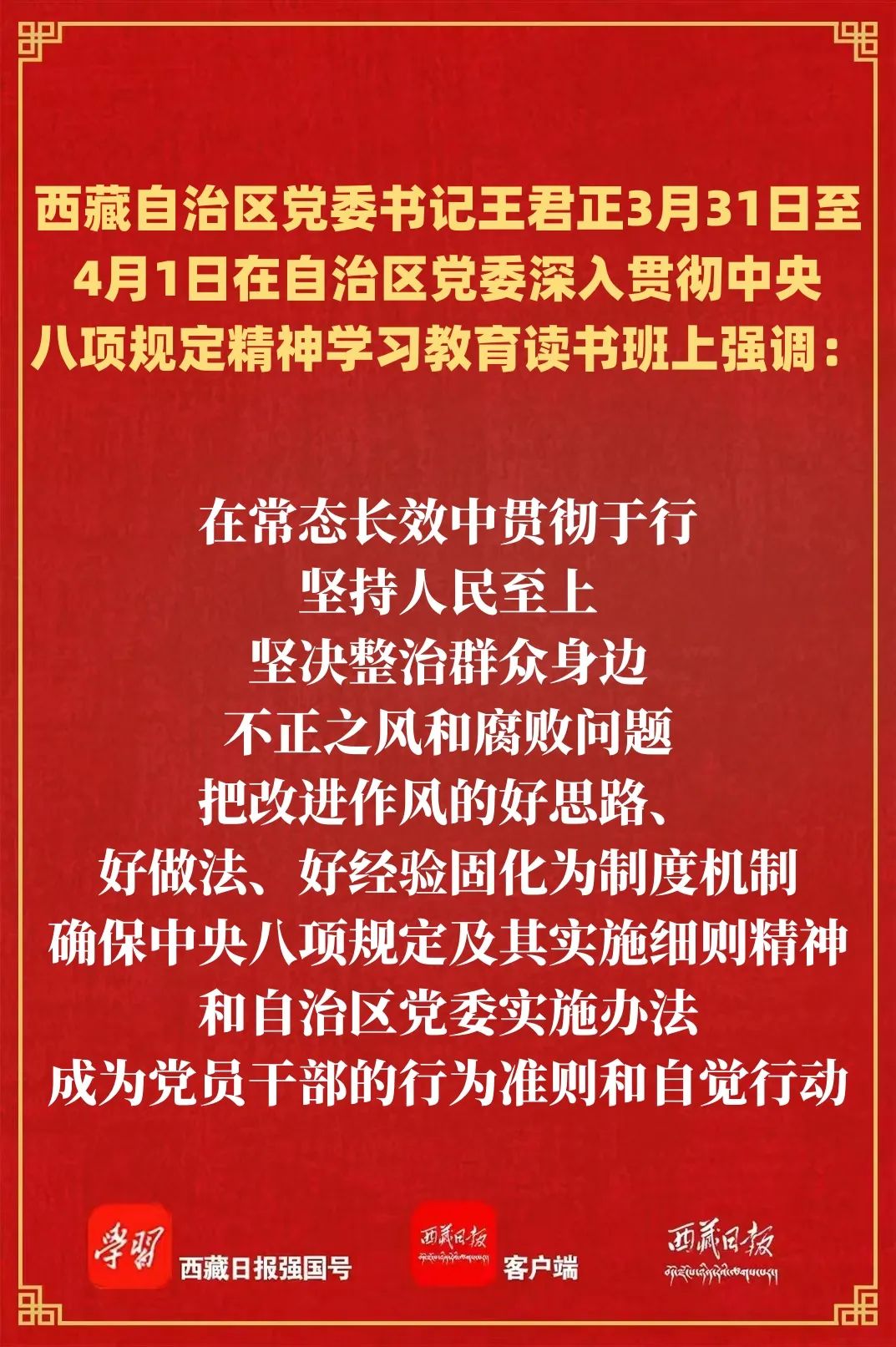 3月31日至4月1日,自治区党委深入贯彻中央八项规定精神学习教育读书班在拉萨举行。自治区党委书记王君正主持并讲话,强调,要深入学习贯彻习近平总书记关于加强党的作风建设的重要论述,领导干部要充分发挥示范带头作用,坚决贯彻执行中央八项规定精神,持续巩固风清气正的政治生态。