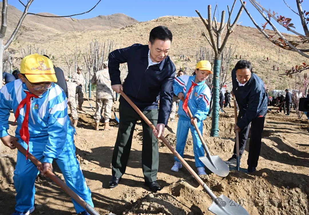 随着南北山绿化工程的深入实施,城关区慈觉林植树点目之所及,已是片片新绿,迸发出无限生机。自治区省军级领导来到植树点,与干部群众、少先队员一起参加义务植树。大家挥锹铲土、培土围堰、提水浇灌,种下榆叶梅、紫叶李、元宝枫等树苗,现场一派繁忙景象。