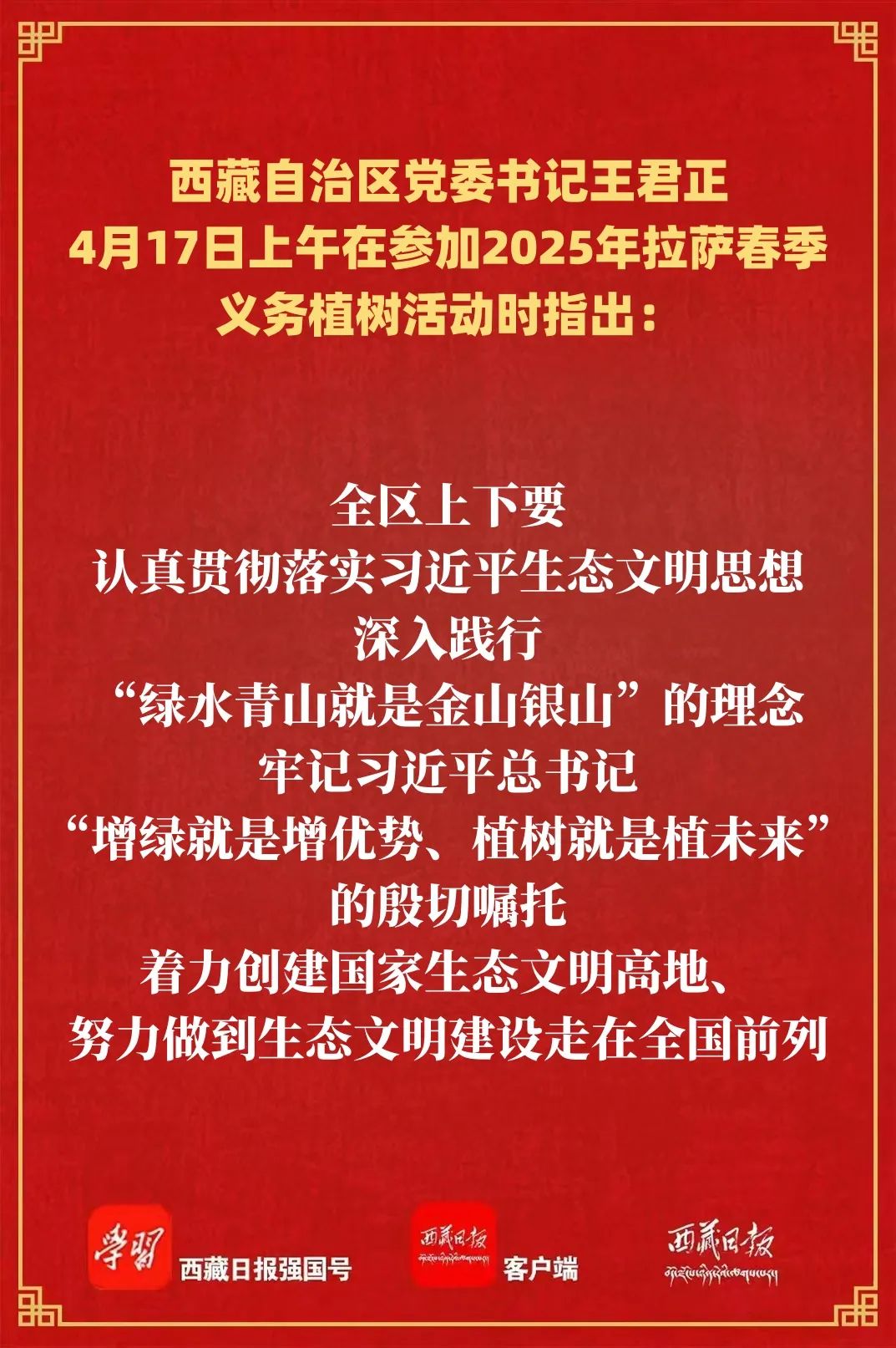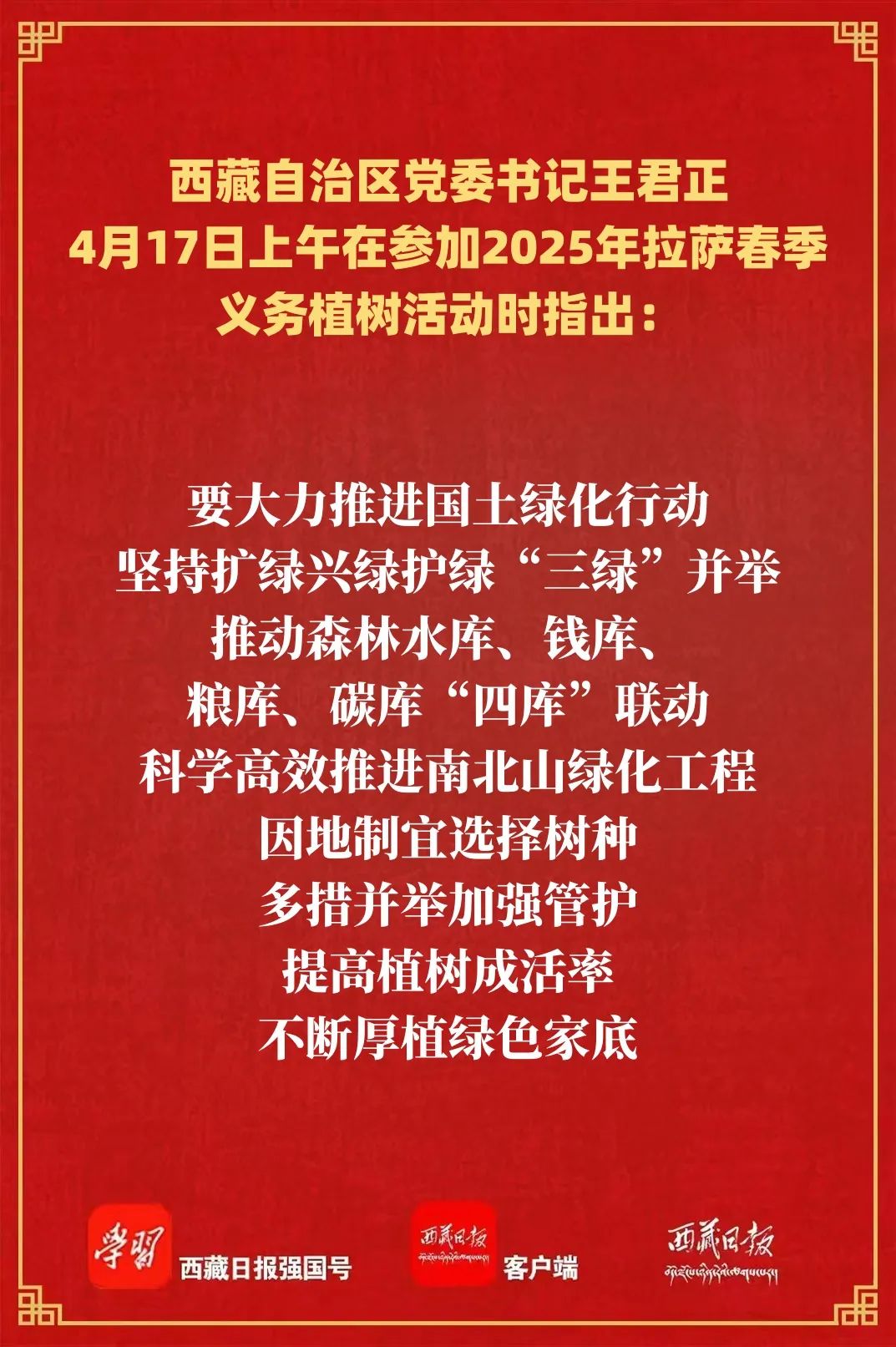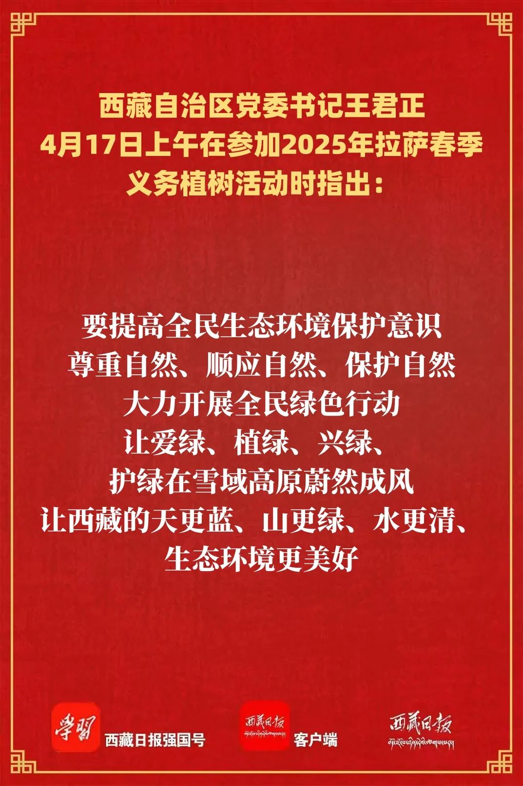 春风催新绿,植树正当时。4月17日上午,自治区党委书记王君正在参加2025年拉萨春季义务植树活动时强调,要深入学习贯彻习近平生态文明思想,持之以恒推进国土绿化行动,提高全民生态环境保护意识,为大地增绿、为生活添彩。