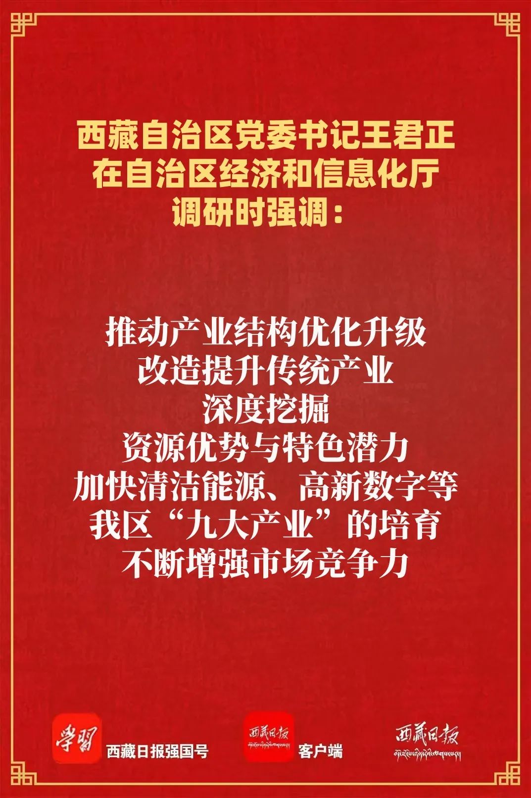 王君正强调,要认真学习贯彻习近平经济思想,习近平总书记关于网络强国的重要思想、关于新型工业化、西藏工作的重要指示和新时代党的治藏方略,深刻把握蕴含其中的科学世界观和方法论,切实用以武装头脑、指导实践、推动工作,聚焦“四件大事”聚力“四个创建”,全面建设社会主义现代化新西藏。积极转变观念,主动顺应新一轮科技革命和产业变革的趋势,把握机遇和挑战,不断提升数字化、网络化、智能化水平。坚持因地制宜,一切从西藏实际出发,有所为有所不为,扬长避短、加快发展。强化科技引领,牢牢把握信息化发展的历史机遇,以信息化助力新质生产力发展。坚持绿色发展,守护好青藏高原的生灵草木、万水千山,把绿色低碳贯穿新型工业化各领域全过程,实现社会效益、经济效益、生态效益有机统一。树立系统思维,加强产业链上下游协作配套,壮大产业规模、优化产业结构,推动产业聚链成群、集群成势。