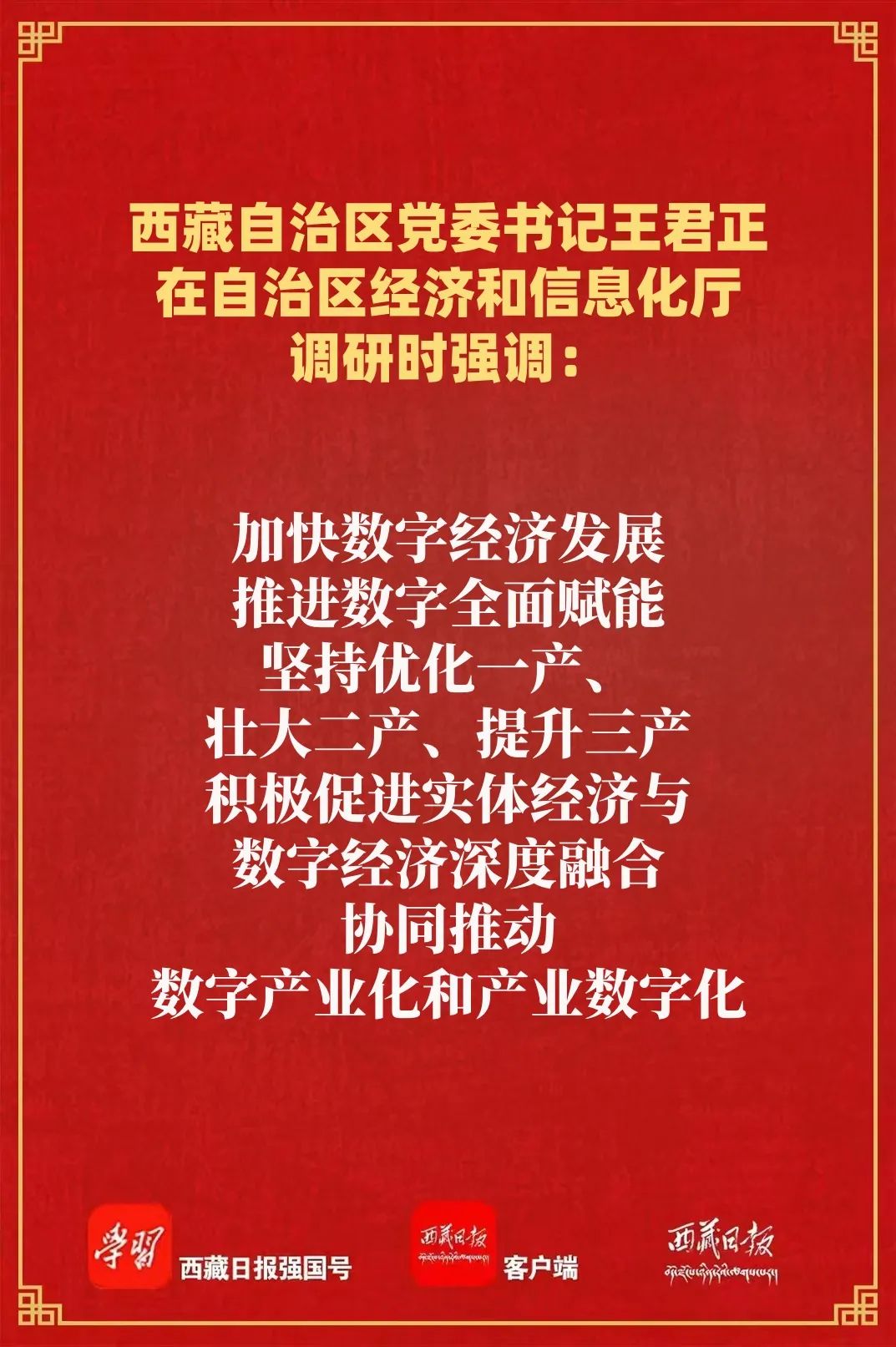 4月29日,自治区党委书记王君正在自治区经济和信息化厅调研时强调,要深入贯彻落实习近平总书记重要指示精神,加快数字经济发展,努力提升我区新型工业化水平,为西藏长治久安和高质量发展作出更大贡献。